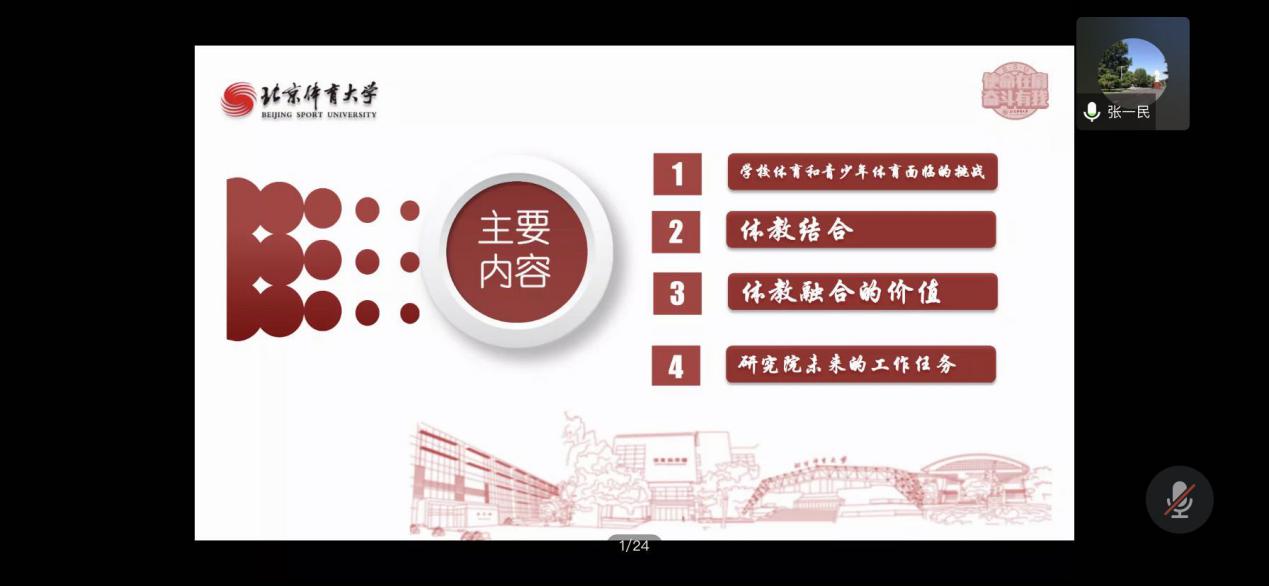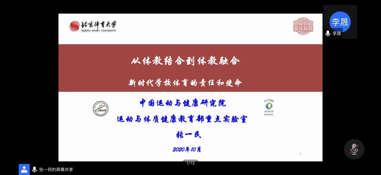 2020年10月9日上午,科研平台联合党总支业务党支部在“腾讯会议”平台承办了必赢nn699net第二十二期“运动与健康”学术沙龙活动,本次活动邀请了我校运动与体质健康教育部重点实验室张一民教授作了“从体教结合到体教融合——新时代学校体育和青少年体育面临的挑战”的学术讲座,此次学术讲座由李晟书记主持,研究院全体师生参与沙龙活动。